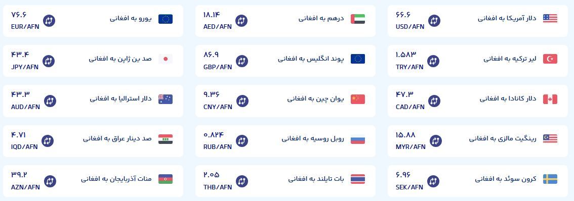 قیمت فعلی افغانی نسبت‌به هفته گذشته، ۰.۹۳ درصد افزایش را نشان می‌دهد.
