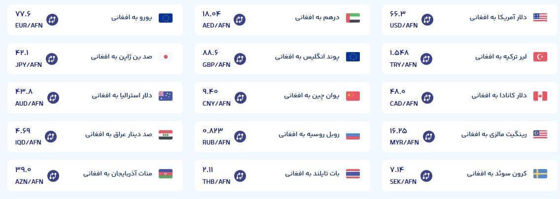 قیمت فعلی افغانی نسبت به هفته گذشته ۰.۰۰ درصد افزایش را نشان میدهد. همچنین بهای هر واحد افغانی در شش ماه گذشته حدود ۶۷.۲۳ درصد افزایش یافته است.
